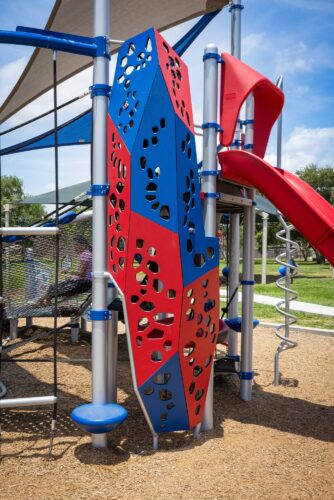 Expanding the fun of the splashpad, a nearby playspace features the Volo® with shade – delivering endless play with over twenty unique activities. With multiple levels, an inner ring, an outer ring, and a mix of climbers and slides, there’s excitement around every turn. The inner ring, crafted with LSI Flexx™, is a durable steel-reinforced cable netting that provides inclusive opportunities for kids of all abilities to climb, bounce, or relax. Plus, the integrated shade keeps kids cool while playing without additional posts taking up room in the playspace. Swings and a talk tube offer even more ways to play.