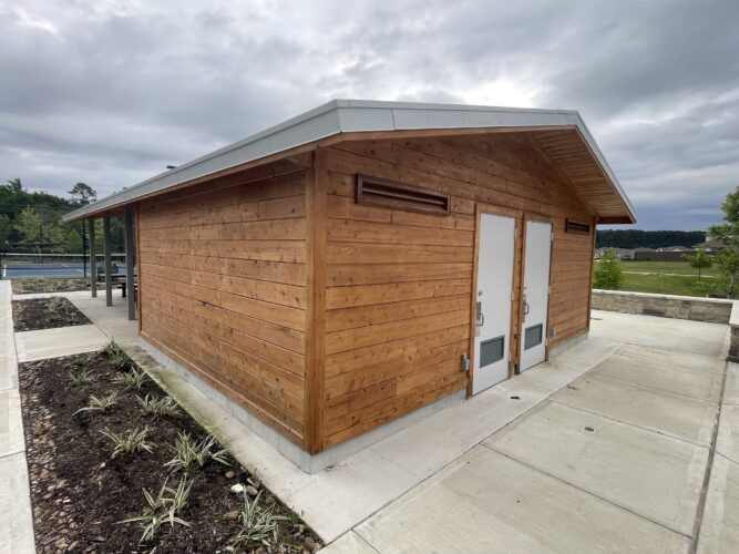 Adjacent to the playground is an Aquatix® splash pad! A FlashFlood, AquaGather Station, and HydroHelix create an exciting Dynamic Zone while a variety of ground sprays round out the space to provide fun for the whole family! A Cedar Forest Parkaire Activity Center provides a comfortable spot to take a break, enjoy a picnic, or use the restroom near both the playground and splash pad spaces.