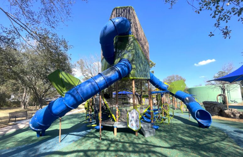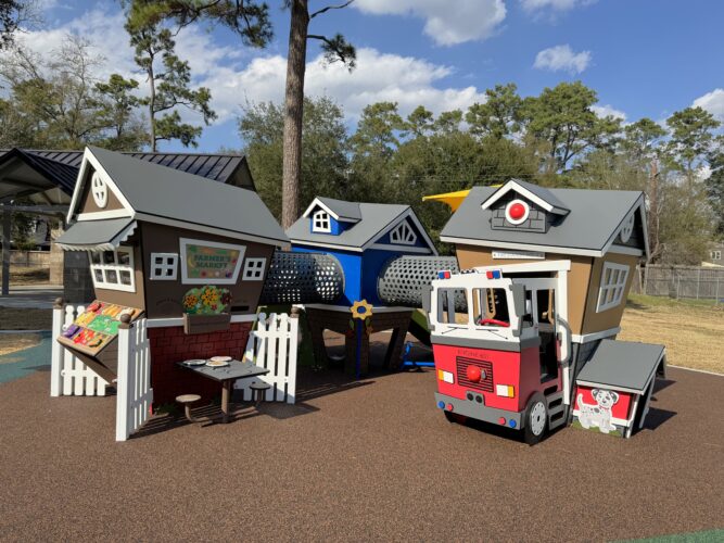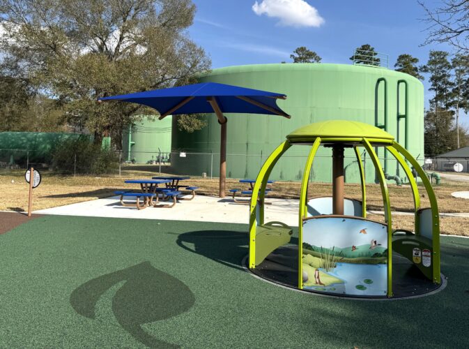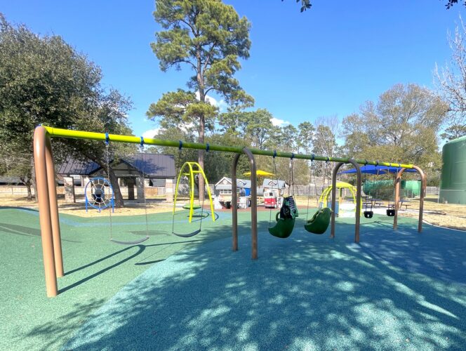 This park also features a Cedar Forest Products Open Gable Shelter providing the perfect spot for community gatherings, and a relaxing place to cool off in the shade. A seamless poured-in-place surfacing features nature elements within the design and ensures easy access to inclusive components throughout the park for users of all abilities.