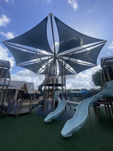 The park features play structures for children ages 2-5 and 5-12, complete with climbers, bridges, and slides. Shade was a top priority throughout the park and Skyways® commercial shades cover most of the play areas! In addition to stand alone structures, shade is directly integrated into the main play structures and swings. Adults can stay active as well with HealthBeat® outdoor fitness equipment protected by overhead hypar sails, creating a comfortable place to work out while keeping an eye on the kids.